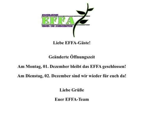 Wir sind ein offenes Kinder- und Jugendfreizeitzentrum im Herzen von Waldniel. Es spielt keine Rolle, welcher Konfession Ihr angehört, ob Ihr ein Handicap habt oder mit welcher Haut- oder Haarfarbe Ihr geboren wurdet. Bei uns im EFFA sind alle herzlich willkommen, die sich unterhalten und spielen möchten, selber ehrenamtlich dabei sein möchten oder unsere Hilfe brauchen.