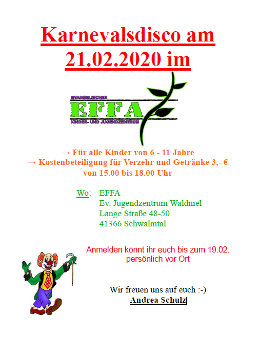 Am 21. Februar wird’s jeck im EFFA. Wir laden alle Kinder von 6 bis 11 Jahren ein zu einer großen, bunten, fröhlichen Karnevalsdisco. Singen, Tanzen, Schunkeln, Spaß haben – seid ihr dabei?