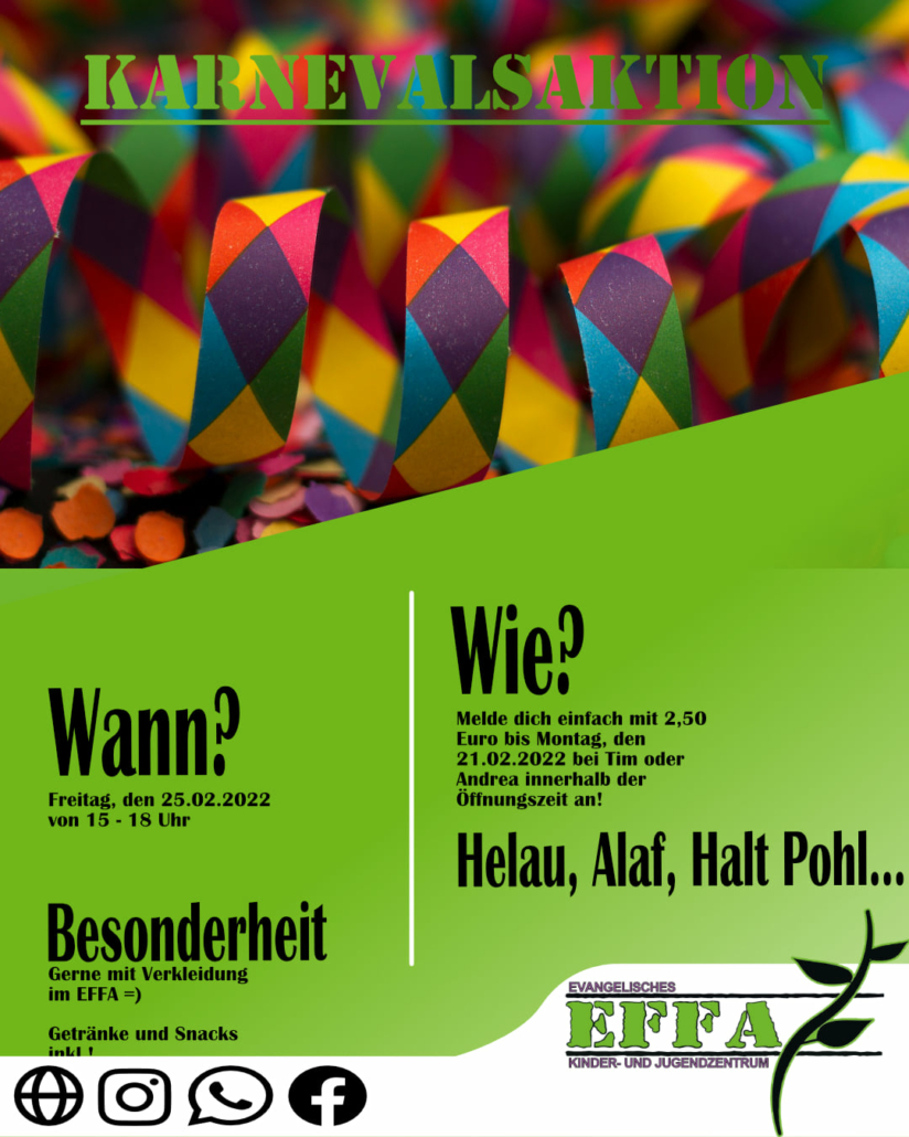 Corona schränkt uns immer noch ein und auch in diesem Jahr ist der große Karneval wieder abgesagt. Das hindert uns aber nicht daran, unter Einhaltung aller Regeln, es im EFFA närrisch werden zu lassen. Nimm teil an unserer Karnevalsaktion, wenn du zwischen 6 und 12 Jahre alt bist. Du musst auf jeden Fall schon ein Schulkind sein. *Anmeldung verbindlich, weitere Infos entnehmt bitte diesem Plakat: