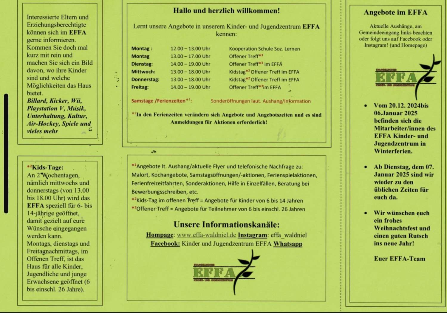 Ab Freitag, dem 20. Dezember verabschieden sich die Mitarbeiter/innen vom EFFA für die offene Kinder- und Jugendarbeit bis zum 07. Januar 2025.