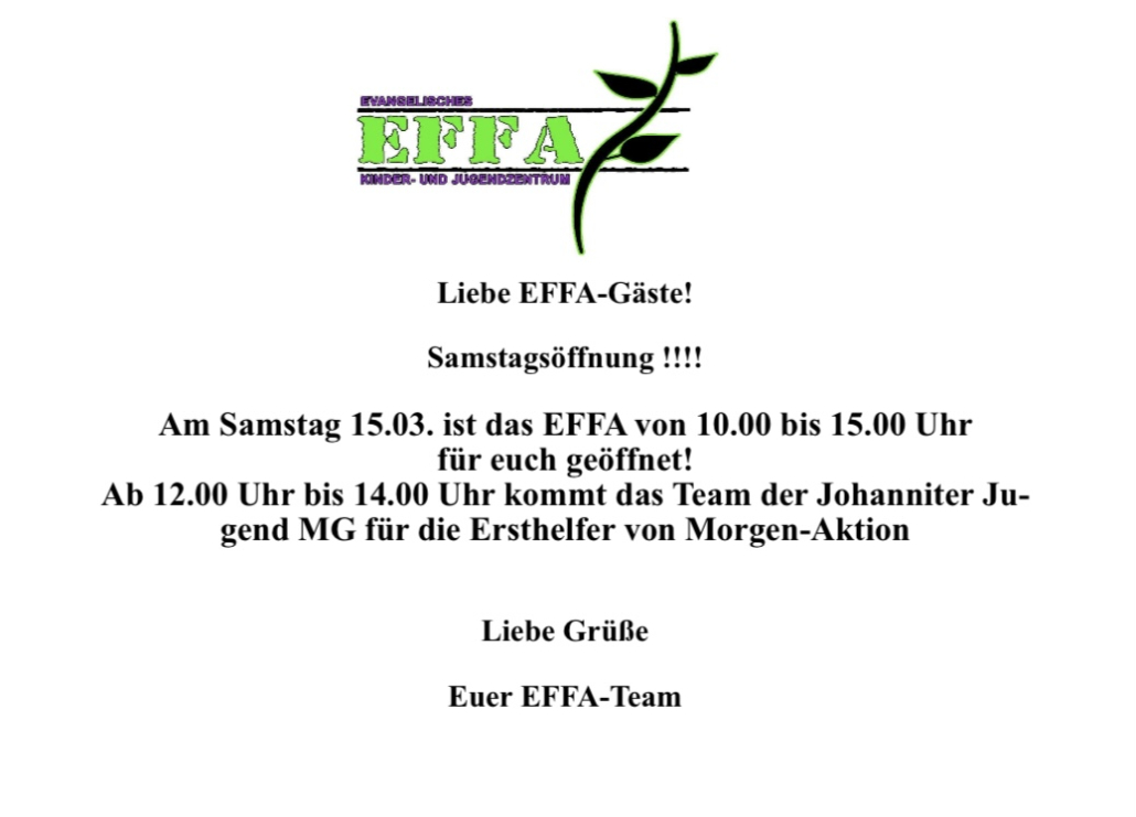 Vom Zentrum im Waldniel gelangt man zum EFFA, indem man am zentralen Kreisverkehr die Lange Straße hinunter geht. In etwa in der Mitte befindet sich die Evangelische Kirche Waldniel mit ihrem angeschlossenen Gemeindezentrum. Das EFFA befindet sich im ersten und zweiten Stock des Gemeindezentrums.