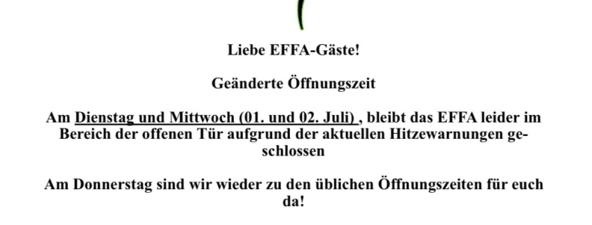EFFA Jugendzentrum und der Wohnwagen an der Brunnenstraße am Dienstag, 1. Juli, und Mittwoch, 2. Juli 2025 geschlossen.